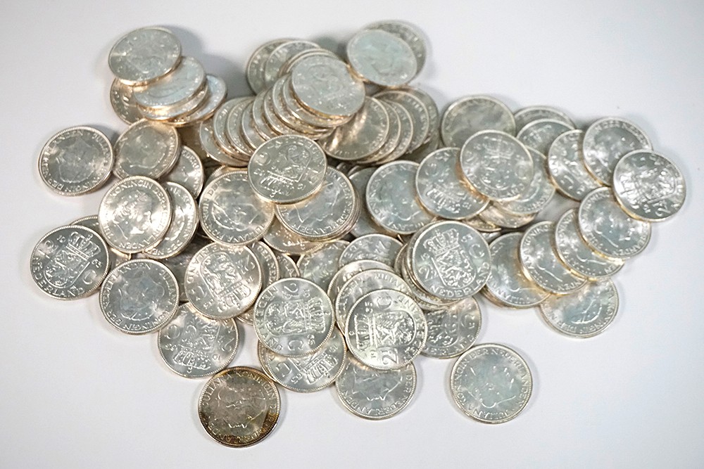 Houten sigarenkistje ‘Balmoral’ met 100 stuks zilveren rijksdaalders 1963 in unc., originele kleur.Netto zilver: 1080 gram.