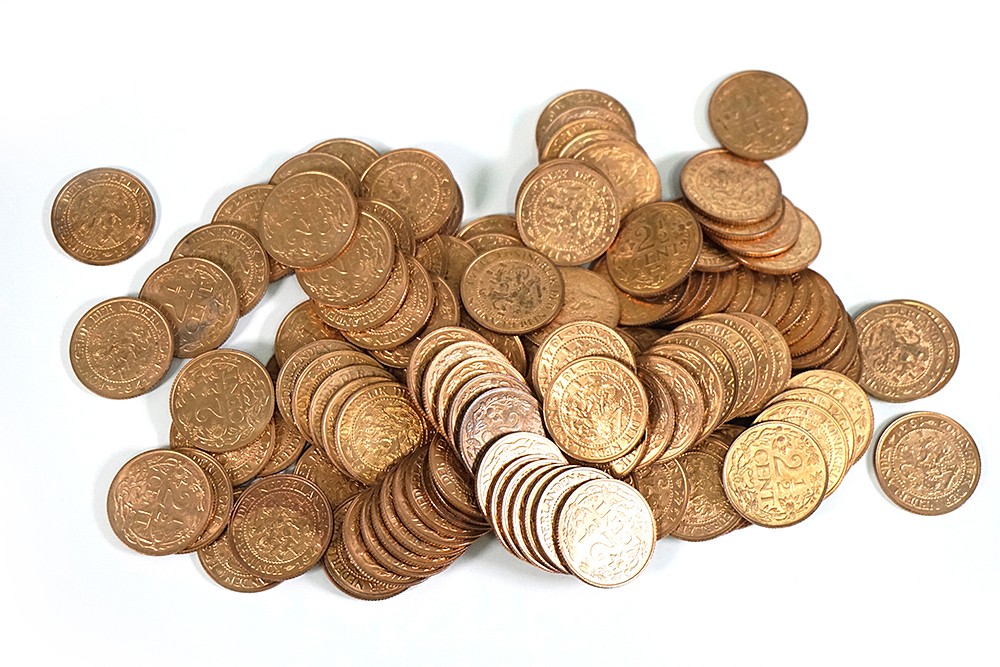 Plastic bakje met 125 stuks bronzen 2½ cent 1941. FDC of bijna FDC met originele kleur.