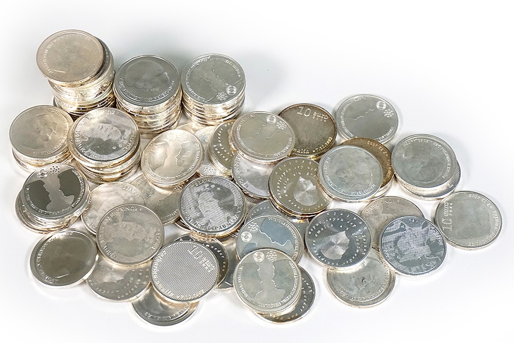 Doosje met 99 zilveren € 10 herdenkingsmunten 2002-2005. Netto zilver: 1630 gram, nominale waarde: 990,--