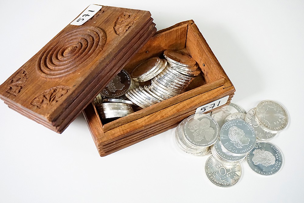 Kistje met 61 stuks zilveren 50 guldenmunten van Beatrix, diverse jaren. Voornamelijk UNC.