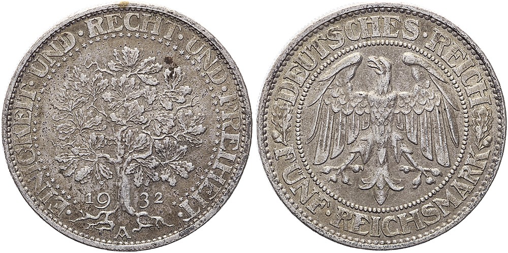 5 Mark 1932A Eichbaum. Jaeger 331; KM 56. Sehr schön.