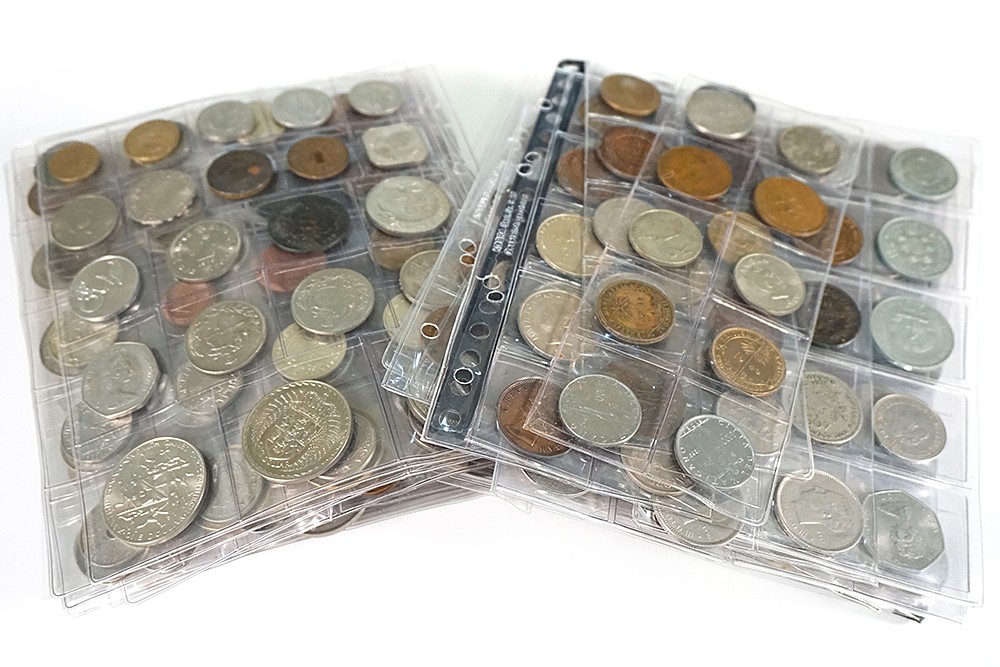 Blauw blik met ca. 7 kilo wereldmunten in muntbladen. Beter kilowaar.