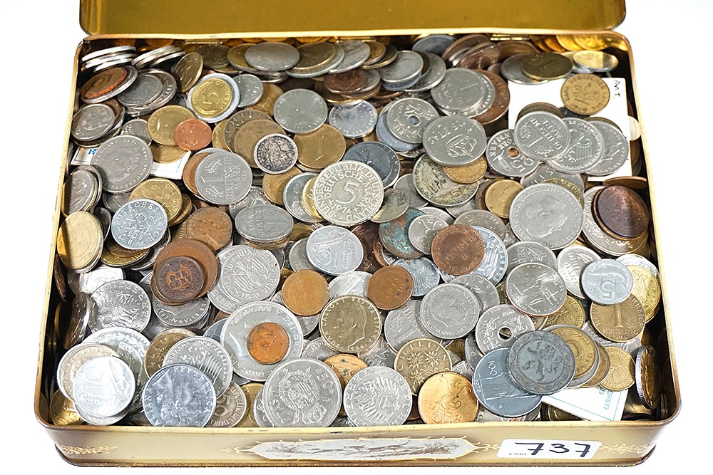 Mooi blik vol met wereldmunten, het zogenaamde betere kilospul! Ca. 6 kg.