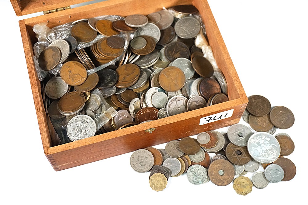 Theekistje Engelse munten + wat koloniën in Afrika. Veel zilver.