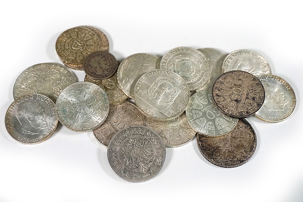 Doosje met vnl. moderne Oostenrijkse herdenkingsmunten 25-500 Schilinng. Totaal: ATS 2250,=