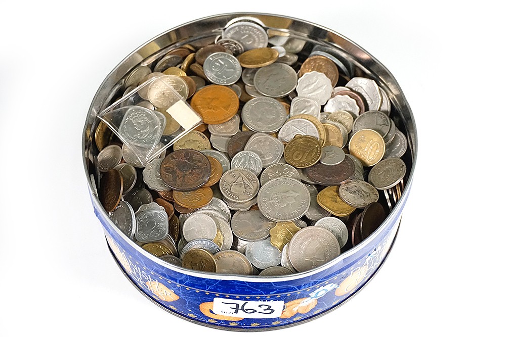 Rond blik met 4,7 kg. wereldmunten. Beter dan kilowaar.