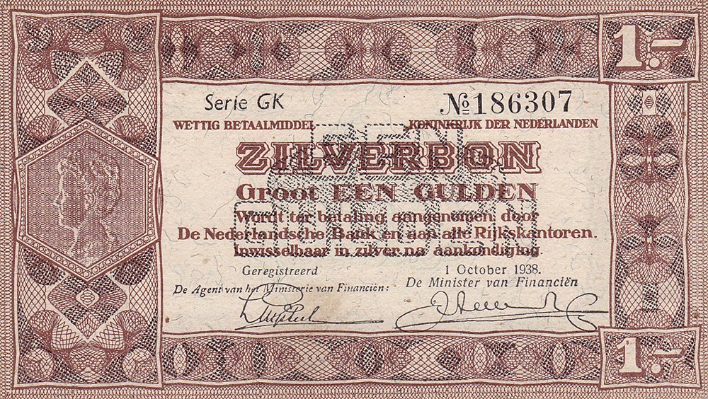 1 Gulden 1938 Zilverbon. Mev. 04-1b; PL4.b. [# GK 186307]. Vrijwel ongecirculeerd.