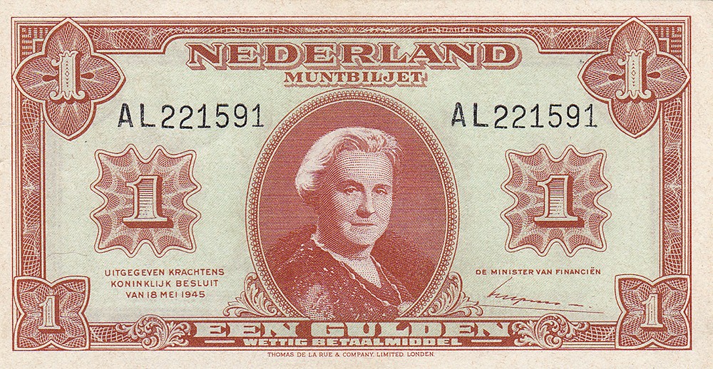 1 Gulden 1945 Wilhelmina. Mev. 06-1b; AV 6.1b. [# AL 221591]. Vrijwel ongecirculeerd.