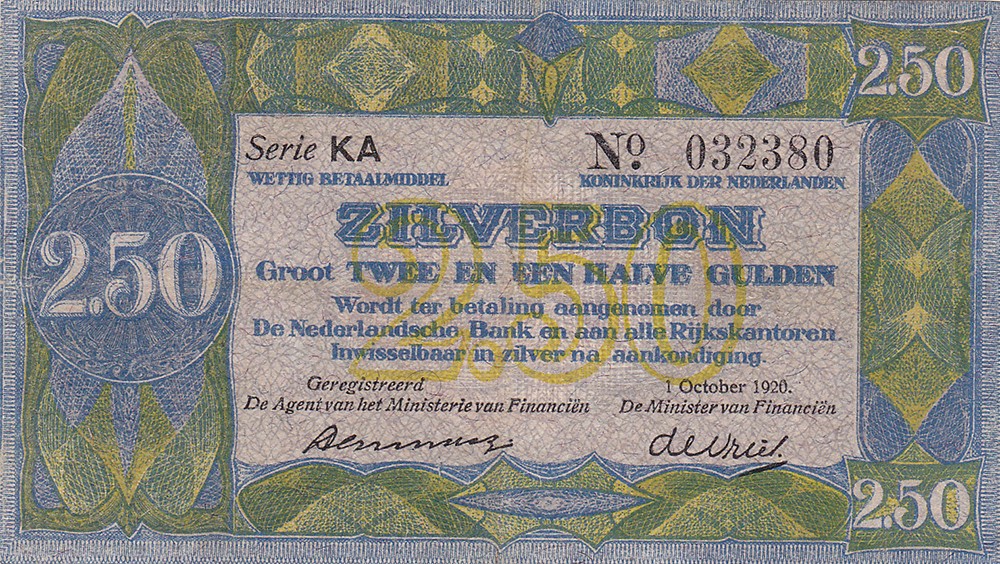 2½ Gulden 1920 Zilverbon. Mev. 12-4b; PL12.c. [# KA 032380]. Uitgifte 3, 1 oktober 1920. Vrijwel ongecirculeerd.