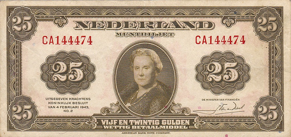 25 Gulden 1943-II Wilhelmina. Mev. 79-1; AV 51.1. [# CA 144474]. Zeer fraai / prachtig.