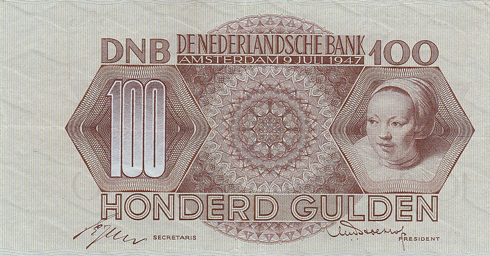 100 Gulden 1947 Adr. Hollaer. Mev. 120-1; AV 84.1. [# 3 AN 083875]. Zeer fraai.