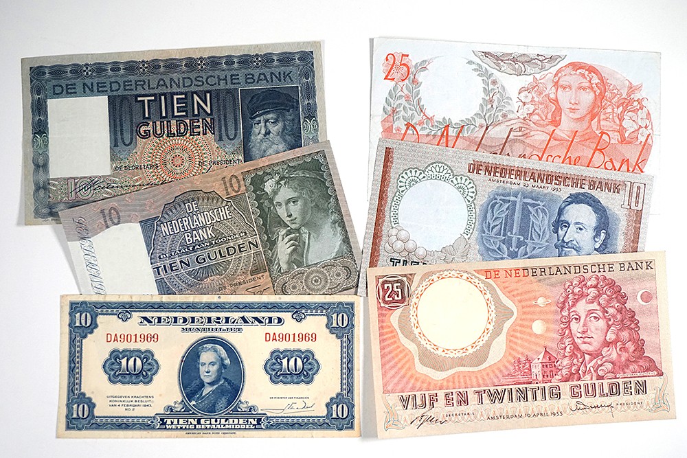 Lot (6) 10 Gulden 1938 Grijsaard [# 6 QW 007396]; 10 Gulden 1942 Schone Herderin [# 6 CF 099715]; 10 Gulden 1943 Wilhelmina ABNC [# DA 901969]; 10 Gulden 1953 Hugo de Groot [# 6 FN 097597]; 25 Gulden 1947 Flora [# 1 BN 018107] en 25 Gulden 1955 Christiaan Huygens [# 2 RN 094474]. Zeer fraai en beter.