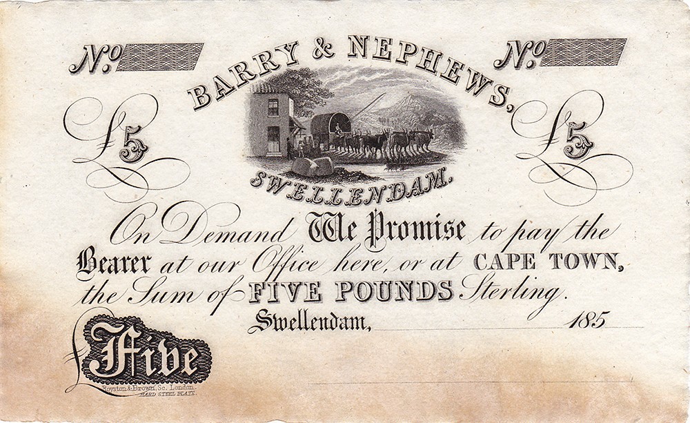 Swellendamm, Barry & Nephews. 5 Pounds 185 (1850-60). Niet in Pick. UNC.