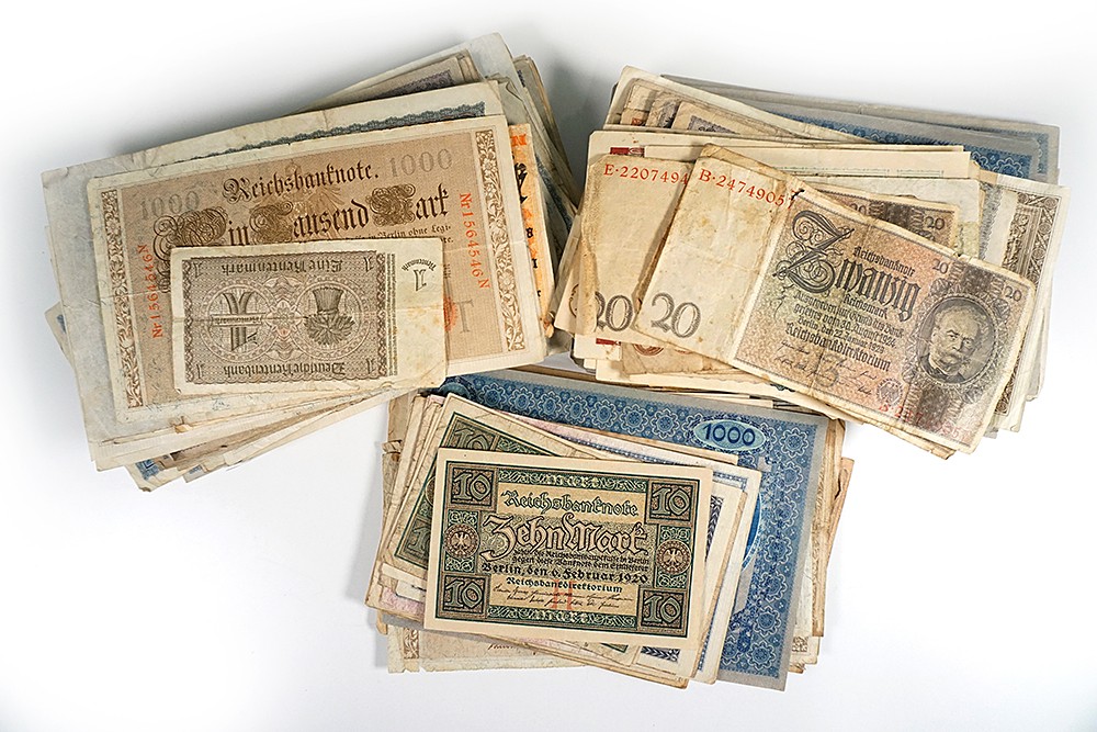 Blauw schoenendoosje met honderden Duits/Oostenrijks inflatiegeld uit de periode 1914-1924.