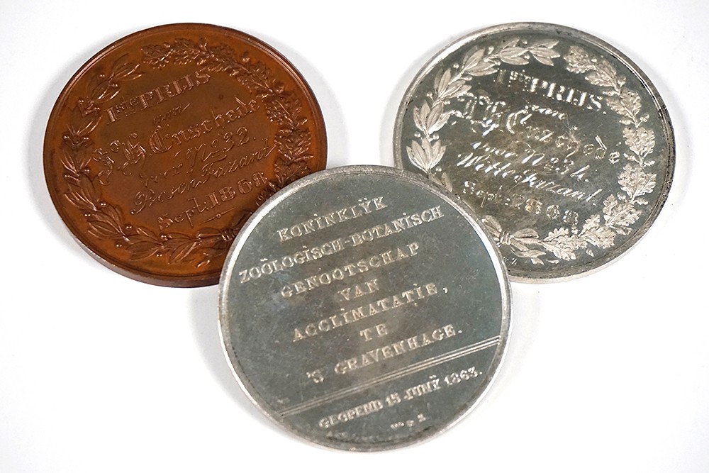 Lot (3) 1863 Den Haag, prijspenning Koninklijk Zoölogisch Botanisch Genootschap van Acclimatie. Achtregelig opschrift. / Inscriptieruimte binnen bladerkrans. AR (2x), Æ 42. Dirks 886. W. Pauwels & Zn. Vlekje op het bronzen exemplaar. Allen met gravering. Prachtig.