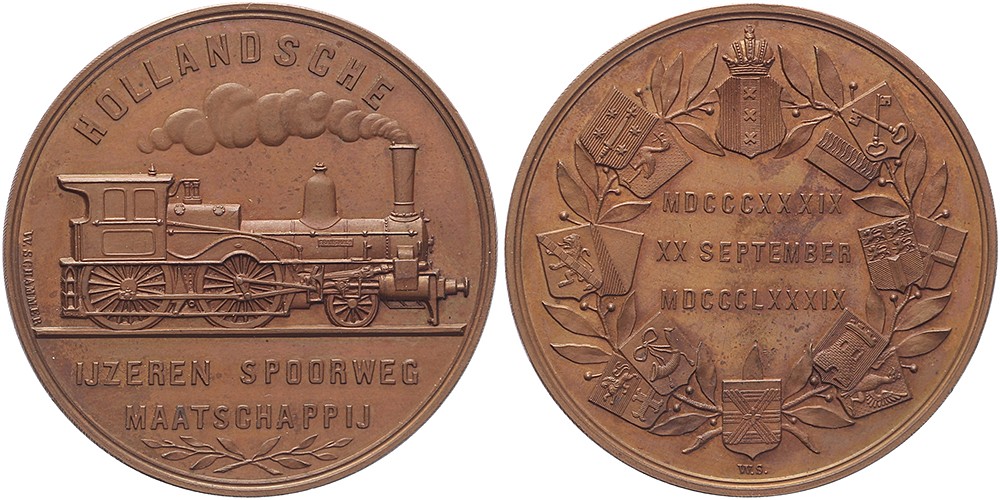 1889 50 Jaar Hollandsche IJzeren Spoorweg Mij. Stoomlocomotief naar rechts. / Drieregelig opschrift omgeven door wapenschilden. Æ 44. Zwierzina 841. W. Schammer. Prachtig.