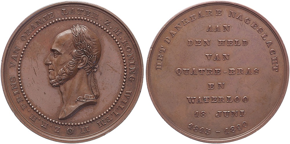 1890 75 Jaar Slag bij Waterloo. Borstbeeld Willem II naar links. / Tekst. Æ 44. Zwierzina 872. (Van der Kellen). Prachtig.