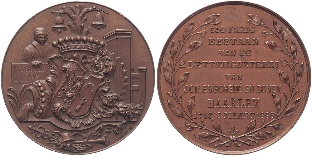 1893 Haarlem, 150 jaar lettergieterij Joh. Enschedé & Zonen. Wapenschild familie Enschedé omgeven door mercuriusstaf, bazuin, letterkast, tandrad en borstbeeld Laurens Janz. Coster. / Achtregelig opschrift. Æ 40. KB I-183; Zwierzina 1035. Niet vaak voorkomend. Prachtig.