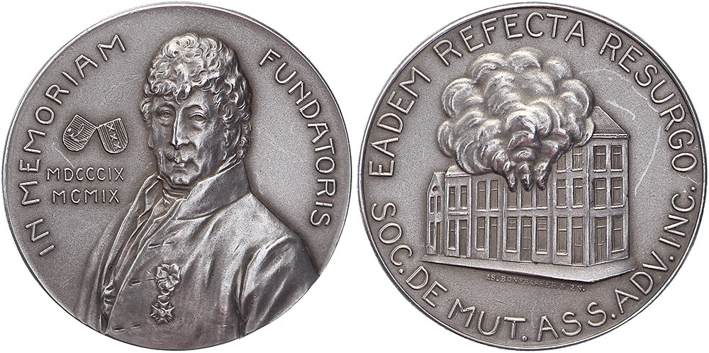 1909 Amsterdam. Eeuwfeest Onderlinge Brandwaarborgmij. De Jong & Co. Borstbeeld oprichter bijna en face. / Brandend gebouw. AR 40. Landi 24. In orig. zwartgelakt doosje. Prachtig / FDC.