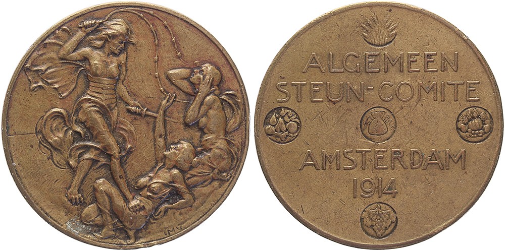 1914 Amsterdam. Algemeen Steuncomité. Symbolische voorstelling oorlog. / Vierregelig opschrift. Æ 41. KB I-1113. M. Vreugde. Zeer fraai.