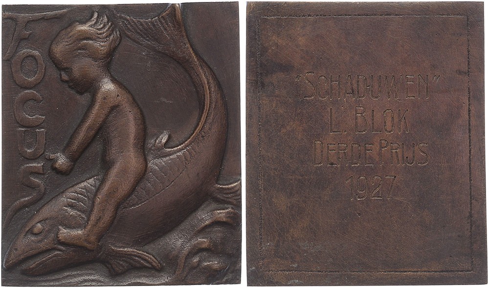(± 1927) Prijspenning tijdschrift Focus. Peuter op vis in het water. / Vierregelige inscriptie.Æ rechthoekig 52 x 44. H. van Ophemert. Zeer fraai.N.B. Een penning van de beeldhouwer Hendrik van Ophemert zijn we nog niet eerder tegengekomen.