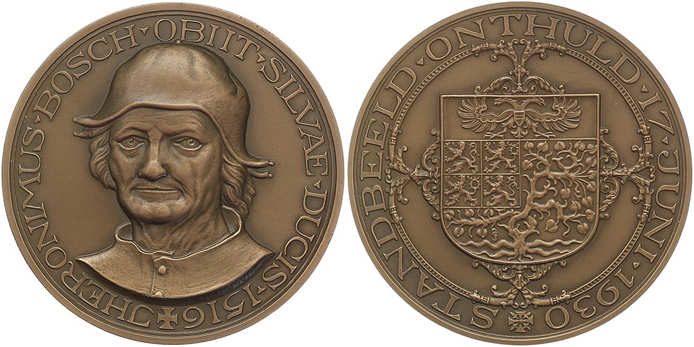 1930 ’s-Hertogenbosch. Onthulling standbeeld Jeroen Bosch. Portret Jeroen en face. / Stadswapen. Æ 60. KB III-397. J.J. van Goor. Prachtig.