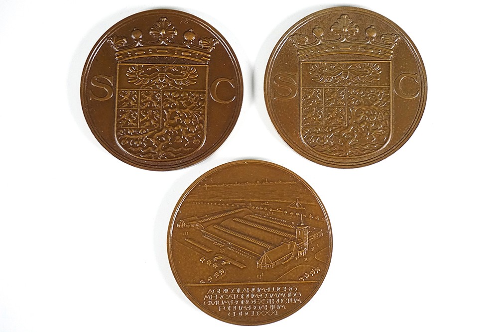 Lot (3) 1931 ’s-Hertogenbosch. Opening veemarkthallen. Gezicht in vogelvlucht op de hallen. / Gekroond stadswapen tussen S – C. Æ 60. KB III-500. (J.J. van Goor). Prachtig.