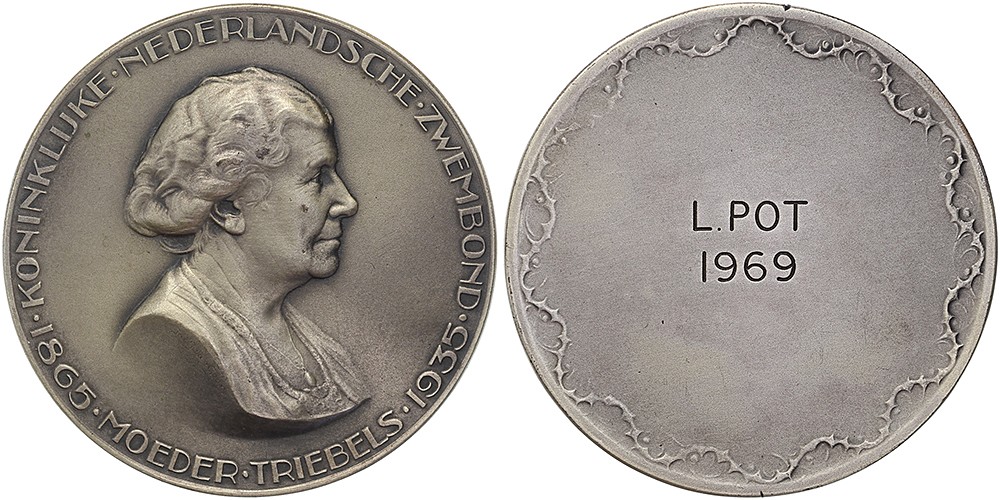 1935 Prijspenning Koninklijke Nederlandsche Zwembond. Portret ‘moeder Triebels’ naar rechts. / Inscriptieruimte binnen hulstkrans. AR 60,5. KB V-929. (J.J. van Goor). Prachtig.