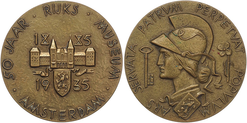 1935 Amsterdam, 50 jaar Rijksmuseum. Gezicht op het museum tussen jubileumdata. / Hoofd Grieks krijgsman. Æ 60. (Dirk Bus). Prachtig.