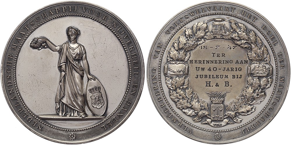1947 Haarlem, erepenning Ned. Mij. voor Nijverheid en Handel. Staande Nederlandse maagd met lauwerkrans en wapenschild. / Inscriptieruimte binnen dikke krans van eikenbladeren. Op naam gesteld. AR 63. (J.G. Holtzhey). In origineel doosje ’s Rijks Munt. Prachtig