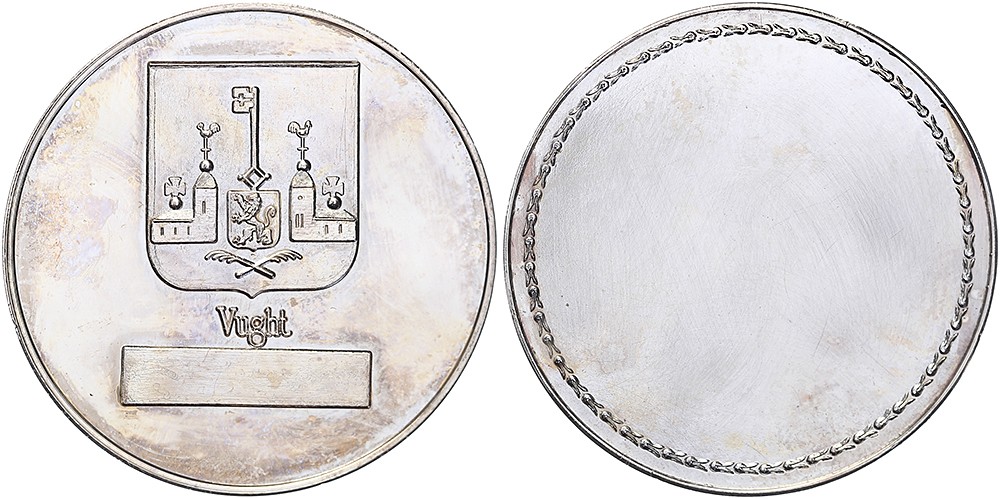 z.j. Vught. Identificatiepenning (?) kerken (?). Boven inscriptiebalkje naamgeving + wapenschild met verticale sleutel tussen Lambertus- en St. Pieterskerk. / Inscriptieruimte binnen bladerrand.Kopernikkel 51. Gepoetst, anders prachtig.