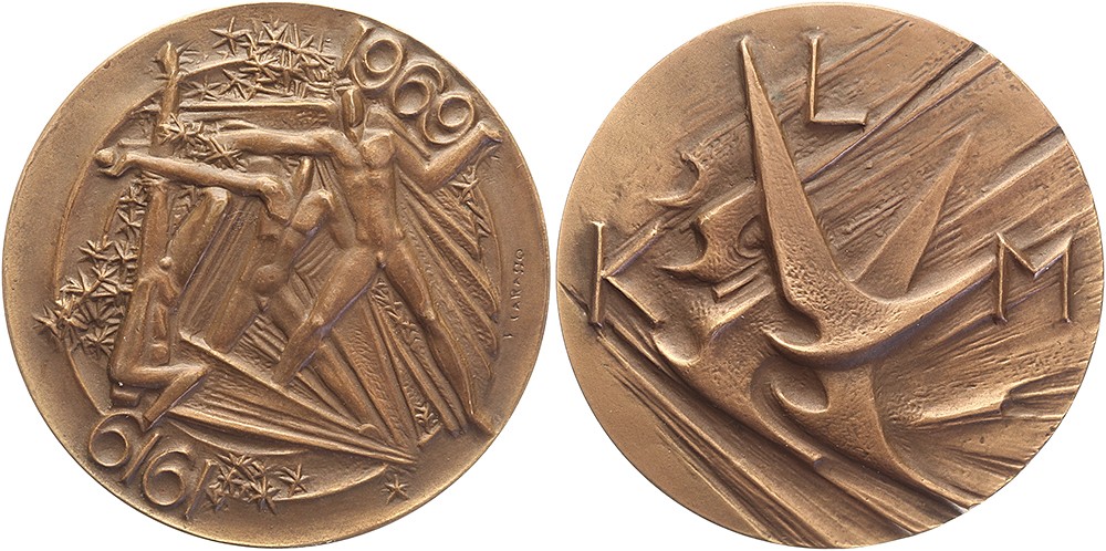 1969 50 Jaar Kon. Luchtvaart Mij. Gestileerde vogels. / Drie naakte mannen. Æ 60. KB VI-3521. Fred. Carasso. Prachtig.