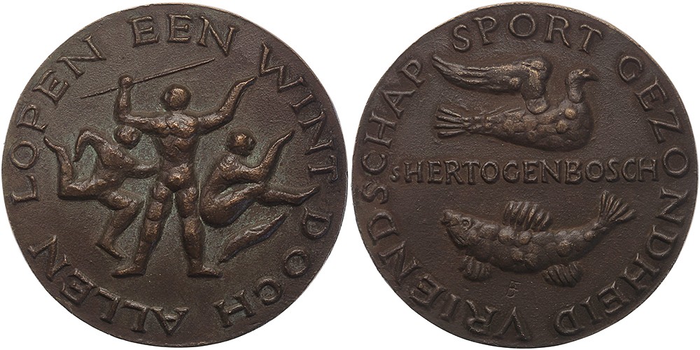 (1978) ’s-Hertogenbosch. Sportpenning. Drie sporters: speerwerper, hardloper en verspringer. / Plaatsnaam tussen duif en vis. Æ gegoten 71. Frans van der Burgt. Prachtig.
