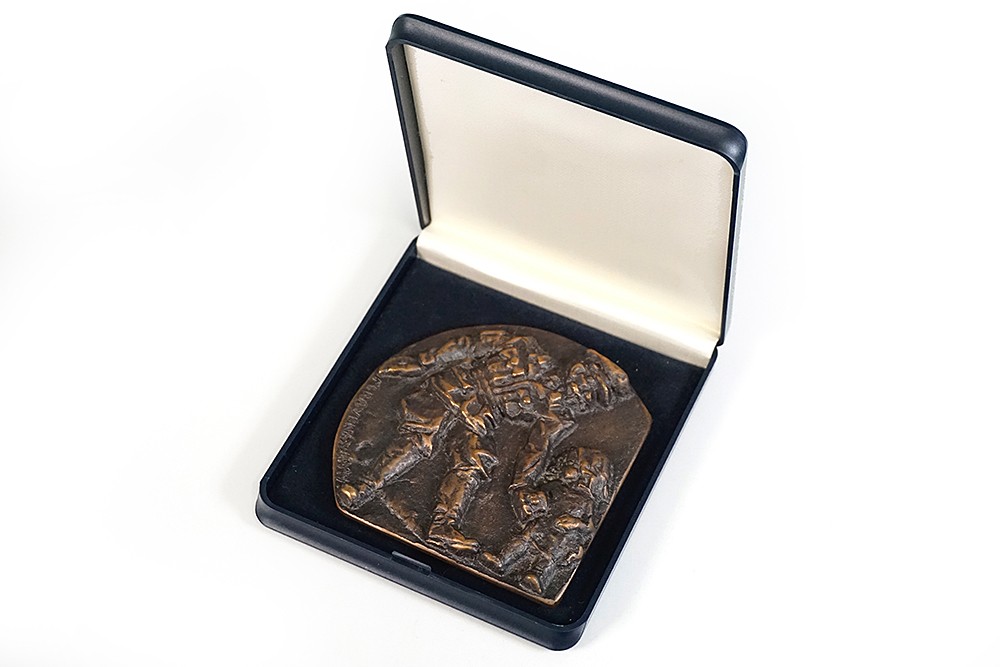 1994 Opheffing korps Rijkspolitie. Agent van de Rijkspolitie buigt voorover en helpt klein meisje. / Logo Rijkspolitie + tekst. Æ gegoten 98 x 97,5. M. Ravenswaay. Prachtig.N.B. Beeldhouwer Marcus Ravenswaaij (1925-2003) heeft niet veel penningen vervaardigd.