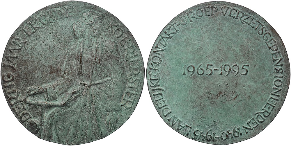 1995 30 Jaar Landelijke Kontaktgroep Verzetsgepensioneerden. Vrouw in manteljas een fiets vasthoudend (Hannie Schaft) / Op- en omschrift. Æ gegoten 115,9. Ruim 700 gram. Mooi groen patina. Gerard van der Leede. Prachtig.
