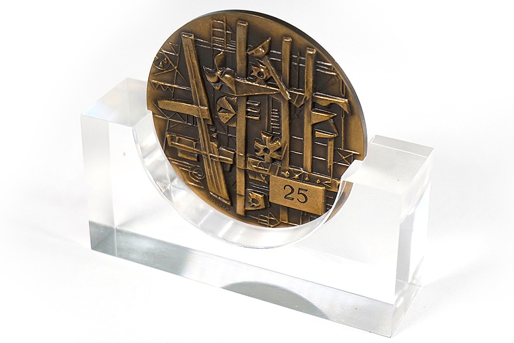 (1997) Erepenning Federatie voor de Metaal- en Electrotechnische Industrie (FME) & Contactgroep Werkgevers in de Metaalnijverheid (CWM). Compositie van diverse staalconstructies. / Inscriptieruimte boven FME/CWM. Op naam van: WOLFKING BELAM, UDEN. Æ 75 + originele plexiglas standaard. Jan Snoeck. Prachtig.N.B. De voorzijde dateert reeds uit 1959.