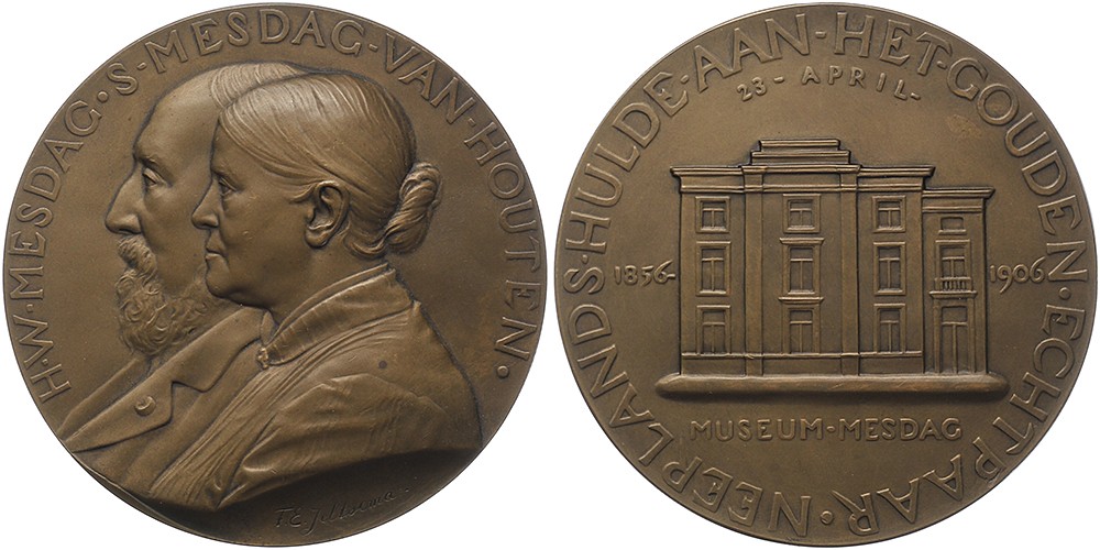 1906 Den Haag. Gouden bruiloft H.W. Mesdag & S. Mesdag – van Houten. Dubbelportret naar links. / Gezicht op museum Mesdag. Æ 90. Zwierzina 605; KB I-650. F.E. Jeltsema. Prachtig.
