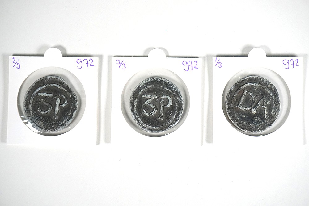 Lot (3) Armenloodjes (?). Vz.: in cirkel D · A · / Kz.: 3P in cirkel.Lood ca. 31 mm. Bodemvondst. Zeer fraai.