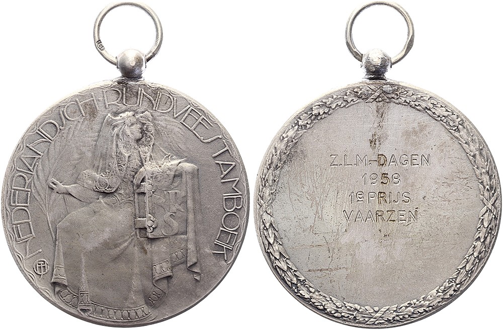 (1923) Prijspenning Nederlandsch Rundvee Stamboek. Zittende vrouw in Zeeuwse klederdracht met palmtak en stamboek. / Inscriptieruimte. Gegraveerd: Z.L.M.-DAGEN 1958 enz. AR 40,5 met draagoog. KB II-365; Jintes/Pol 105. Zeer fraai.