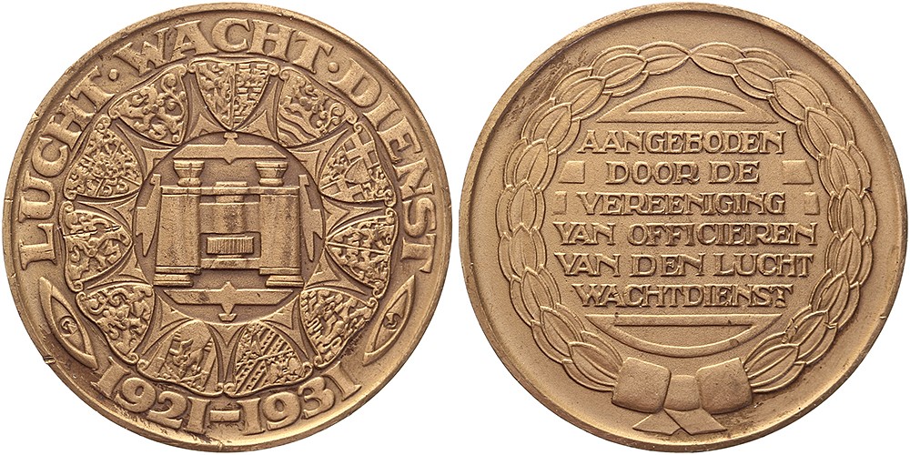 1931 Vrijwillig Landstormkorps Luchtwachtdienst 10 jaar. Verrekijker omgeven door elf provinciewapens. / Zesregelig opschrift binnen brede krans. Æ 40,5. JMP 1932, pag. 186, nr. 333. Prachtig.