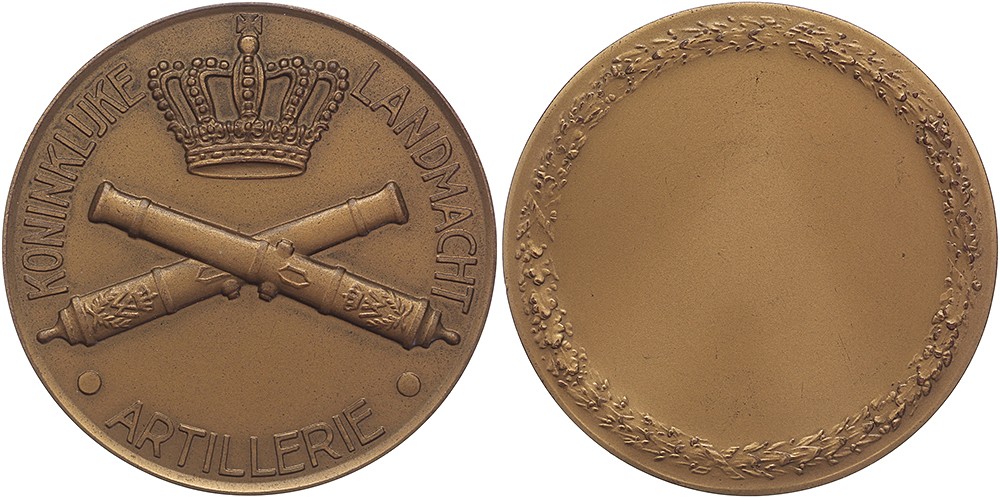 (1939) Erepenning Koninklijke Landmacht – Artillerie. Twee gekruiste kanonnen onder koningskroon. / Inscriptieruimte. Æ 50,3. KB V-1328. (J.J. van Goor). Prachtig.