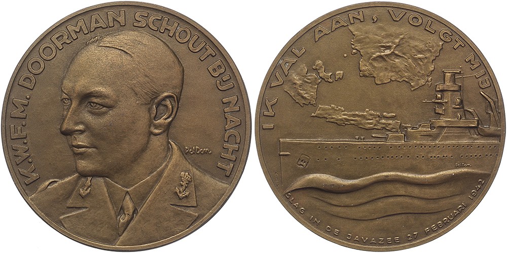 1942 Slag in de Javazee. Borstbeeld schout-bij-nacht Karel Doorman. / Vlaggeschip ‘De Ruyter’.Æ 60. KB V-1645. Pol Dom. Prachtig.
