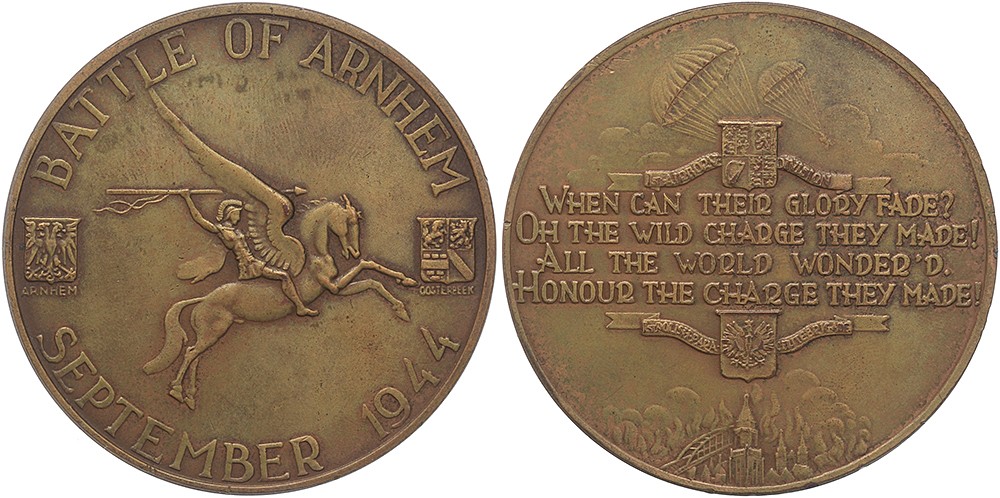 1944 Slag om Arnhem. Griekse krijger op Pegasus naar links. / Landende parachutisten boven brandend Arnhem. Æ 60. JMP 1950, pag. 132, nr. 69. (A. Diekerhof). Tikje rand kz. Zeer fraai.