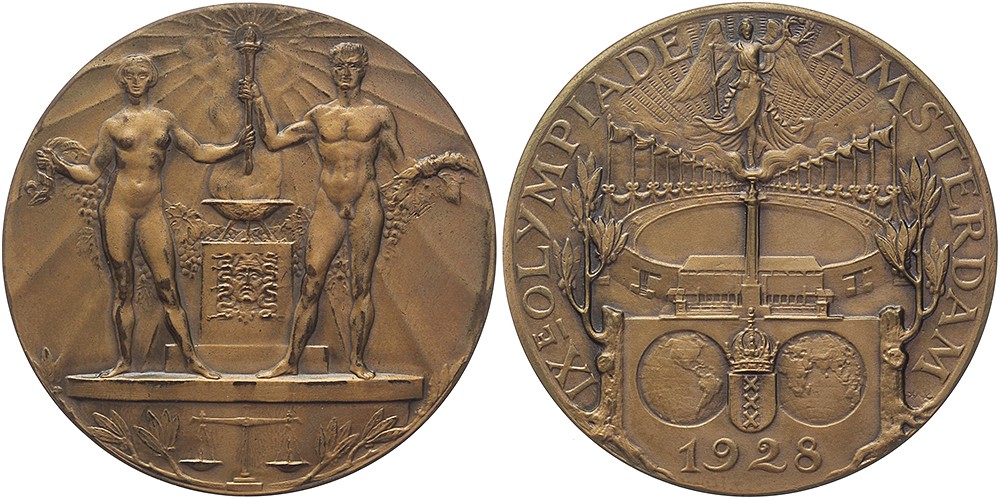 1928 Amsterdam. Twee naakte atleten houden brandende fakkel hoog. / Het Olympisch stadion boven stadswapen en wereldbollen. Æ 55,5. Gad./Vesc. 2. Prachtig.