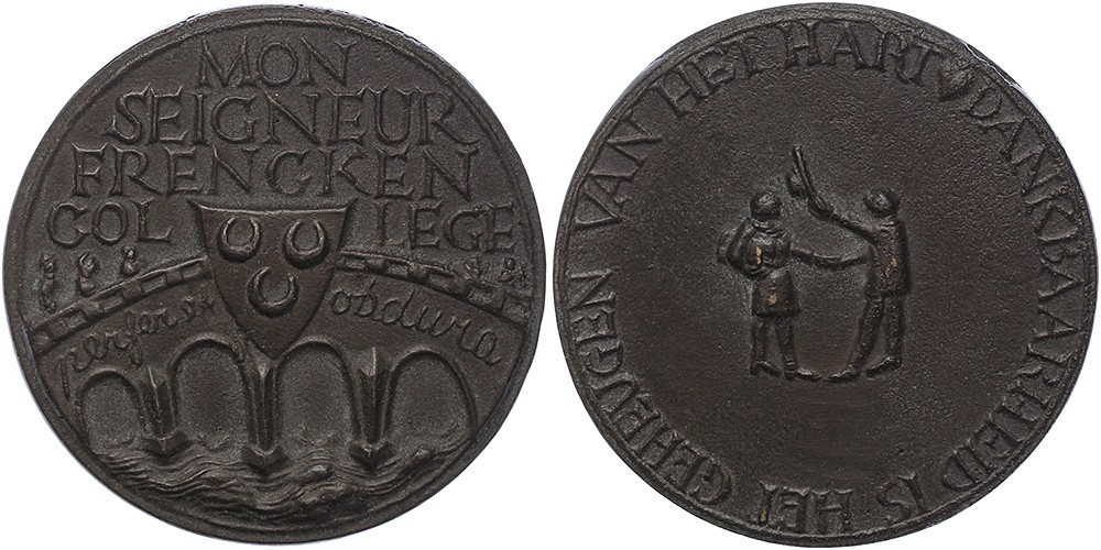 (1967) Oosterhout. Mgr. Frencken College. Boogbrug met Oosterhouts wapenschild. / Professor neemt afscheid van leerling. Æ gegoten 70. KB VI-3310; Van der Kam P6702. Prachtig.