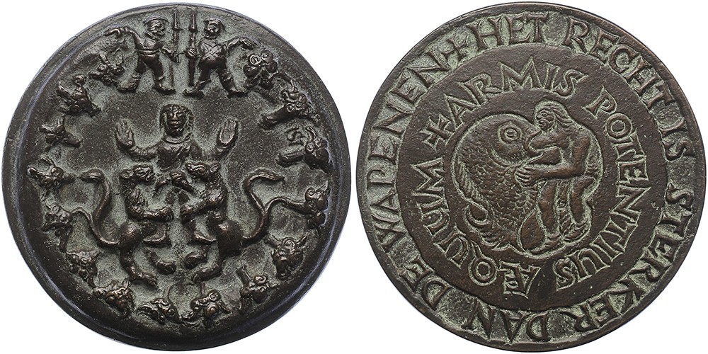 (1979) Vredespenning. Daniël in de leeuwenkuil onder twee wachters. / Tobias haalt gal uit vis om zijn blinde vader te genezen. Æ gegoten 94,5. Tilanus pag. 399-401; Van der Kam P7906. Prachtig.