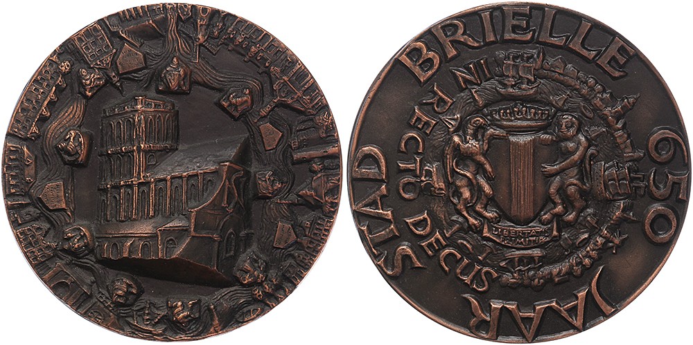 1980 Brielle 650 jaar. St. Catharinakerk omgeven door bastions met bekende personen en poorten met Brielse gebouwen. / Gekroond gemeentewapen gehouden door griffioen en cerberus.Æ 70. Kreuk/Mev. 245; Van der Kam P8003. Nr. in rand. Prachtig.