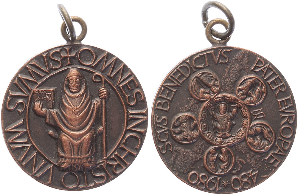 1980 Benedictuspenning I. Tronende Benedictus met staf en boek. / Over de kaart van Europa zes medaillons met diverse voorstellingen uit het leven van Benedictus. Æ 30 met draagoog. Van der Kam P8004. Prachtig.