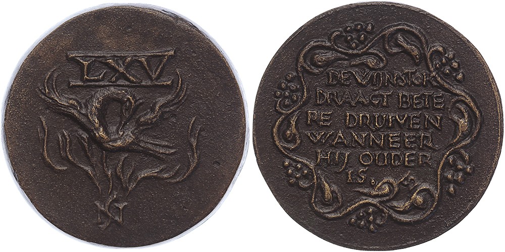 (1980) Verjaardagspenning voor een 65-jarige vrouw. Rijzende Phoenix. / Zesregelig opschrift in rand van druiventrossen. Æ gegoten 49,5. Van der Kam P8008. Prachtig.