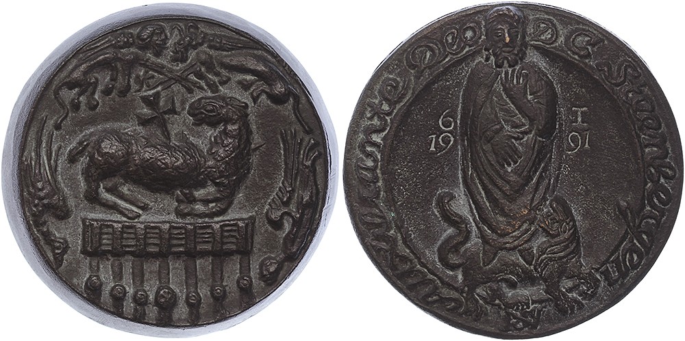 1991 Geboorte Daniël Cornelis Steenbergen, kleinzoon van de medailleur. Daniël in de leeuwenkuil zegeviert over leeuw. / Lam Gods boven boek met zeven zegels. Æ gegoten 57,4. Van der Kam P9101. Prachtig.